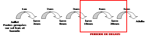 >> Les larves se nourrissent de petites racines qu'elles sectionnent, ou creusent des cavités dans les racines plus agées
