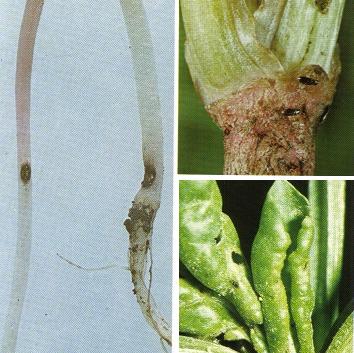 Petites taches noires sur l'hypocotyle au niveau du sol (morsures de l'insecte).