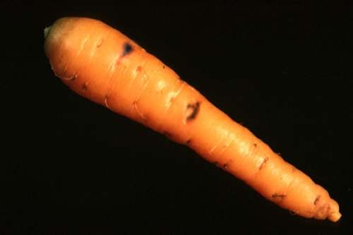 >> Petites taches rondes à elliptiques (<1cm de diamiètre), translucides --> dépressions marrons claires --> Les racines se fendillent et éclatent.