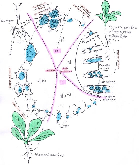 Déformation des racines : racines pivotantes et secondaires avec des tumeurs (galles qui peuvent atteindre 5cm de diamètre) dont l'intérieur est sans cavité.