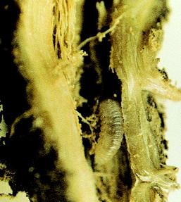 | Caractéristiques : se localise dans les collet, pivot, racines |