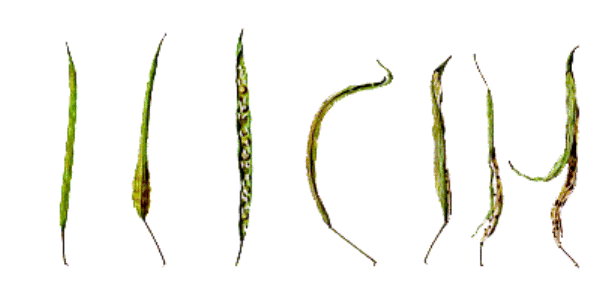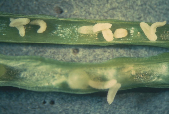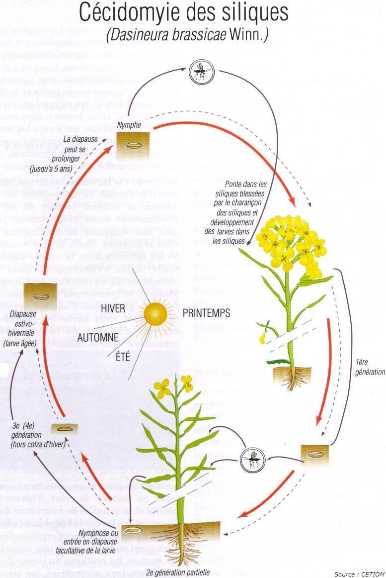 Les larves provoquent des boursouflures de la silique qui s'égrène.