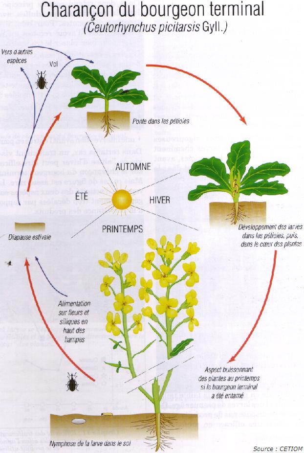 Ceci provoque la suppression du bourgeon terminal, les bourgeons axillaires se développent, ce qui provoque des petites tiges et un port buissonnant : le rendement peut être fortement affecté car le colza devient moins productif. |