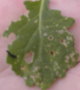 Les larves sont des fausses chenilles défoliatrices qui rongent les feuilles à partir de la face inférieure et du bord, ne laissant subsister que les nervures. Ce sont les même dégâts que les limaces mais sans la bave mais on peut observer des déjections sur les feuilles.