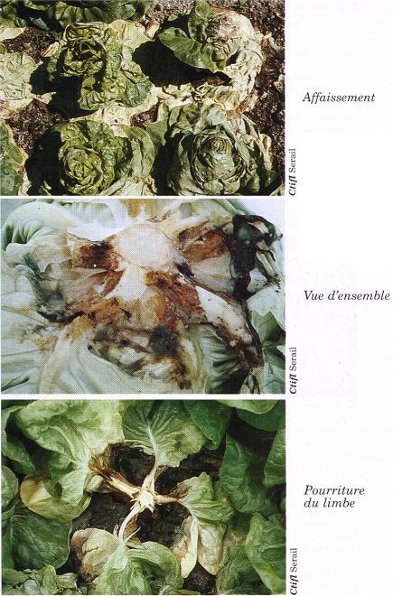 Souvent les dégâts sont constatés à la récolte. Pourriture des feuilles de la base en contact du sol sans faire flétrir la laitue