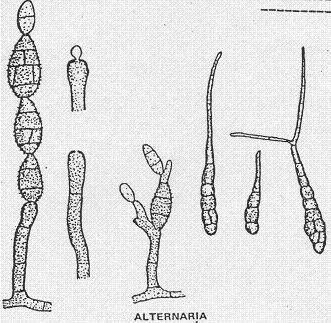 ALTERNARIA : Les conidies sont de forme allongée, foncées, pluricellulaires et cloisonnées transversalement et longitudinalement.
