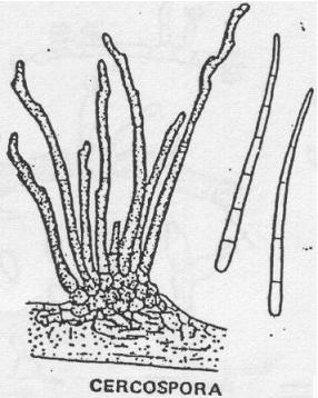 CERCOSPORA : Conidies pluricellulaires (filiformes). Conidiophores foncés. Conidies hyalines, très filiformes.
