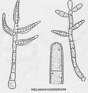 HELMINTHOSPORIUM : Conidies pluricellulaires (cloisons transversales). Conidiophores dressés, foncés, à conidies latérales.