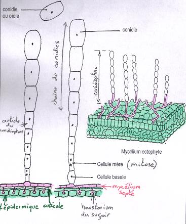 OIDIUM : Mycélium externe avec suçoir. Conidies (oïdies) en forme de tonnelet disposées en chaînette de 4 à 8 conidies. Conidies à formation rapide et désarticulation lente (chaîne longue).